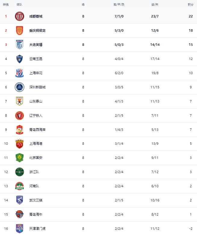 在积分榜上,成都蓉城排名榜首,战绩是7胜1平,拿到22分。重庆铜梁龙战平之后,总积分是18分,排名第2。大连英博输球之后,依然是15分,排名第3。云南玉昆4胜4负亚博轮盘,拿到12分,排名第4。上海申花赢球之后,总积分是10分,升到了第5的位置。被扣掉10分的情况下,上海申花能够这么快爬到这样的位置,非常不容易。上海海港5分,排名第10。北京国安3分,排第11。浙江队也是3分,排名第12。
